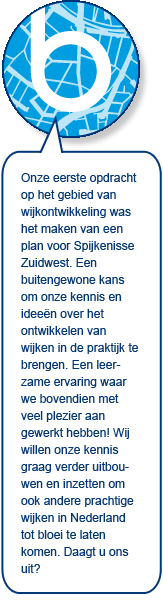 Onze eerste klus op het gebied van wijkontwikkeling was het maken van een plan voor Spijkenisse Zuidwest. Een buitengewone kans om onze kennis en ideeën over het ontwikkelen van wijken in de praktijk te brengen. Een leerzame ervaring waar we bovendien met veel plezier aan gewerkt hebben! Wij willen onze kennis graag verder uitbouwen en inzetten om ook andere prachtige wijken in Nederland tot bloei te laten komen. Daagt u ons uit?