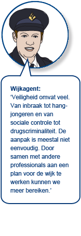 Het verbeteren van de veiligheidsbeleving is een samenspel met het aanpakken van thema’s als de fysieke structuur en sociale cohesie. Daarnaast zijn er binnen het thema zelf ook een aantal concrete pijlers aan te wijzen zoals inzet op de jeugd (hangjongeren), high impact crimes (criminaliteit met veel exposure in de wijk zoals overvallen en inbraken), hard aanpakken overlast en goede samenwerking tussen politie, corporaties en gemeente.